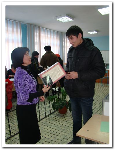 На снимках: На избирательном участке № 1003. На избирательном участке № 1002 член УИК Р.Ф. Байгутлина поздравляет Артура Зайнуллина, впервые принявшего участие в выборах.